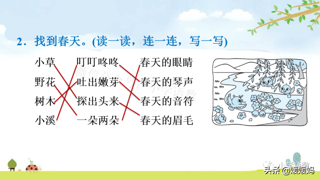 2..“我们”从哪些景物中找到了春天?“我们”从地下探出头的小草、早开的野花、吐出嫩芽的树木、解冻的小溪等景物中找到了春天。