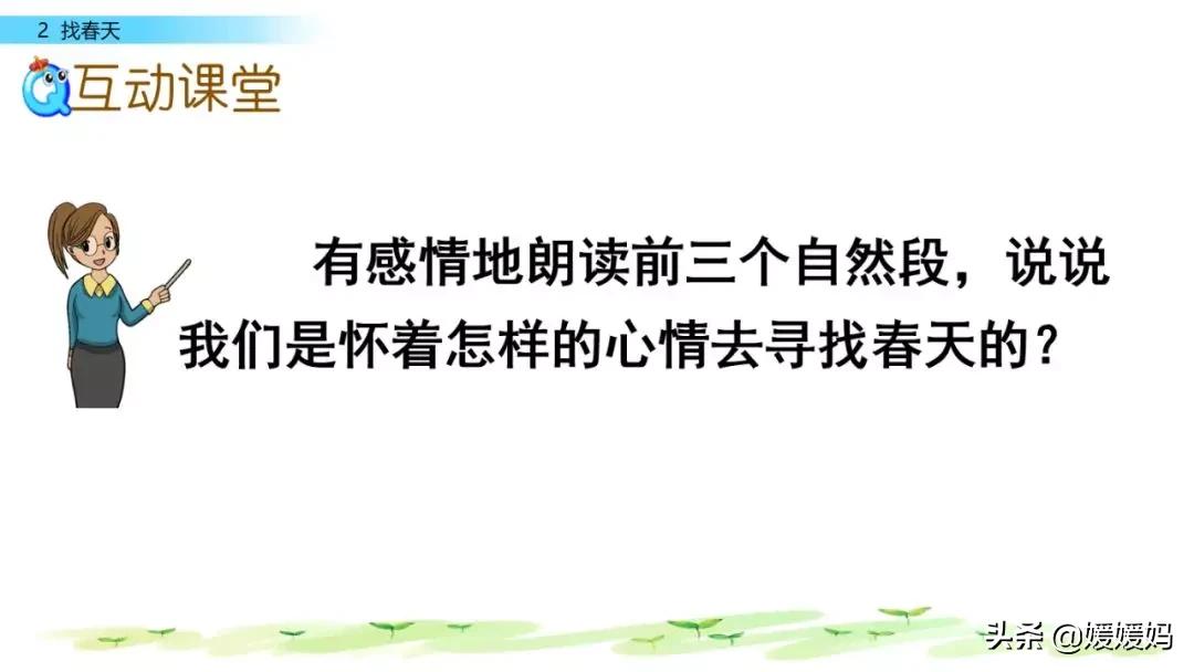 问题归纳:1.我们几个孩子,脱掉棉袄,冲出家门,奔向田野,去寻找春天。句中的“冲出”换成“走出”好不好?为什么?不好。因为“冲出”指的是“快速地向前闯”,说明孩子们走出家门的速度很快,表达了他们想看到春天的急切心情,而“走出”表达不出这种急切的情感。