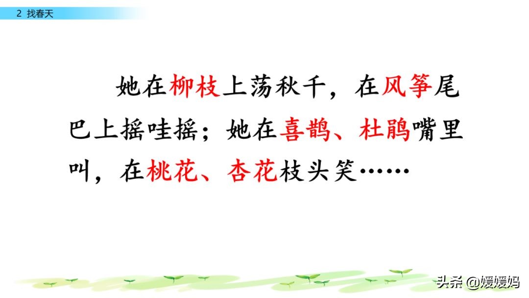 3.“我们”找到的春天是怎样的?作者找到的春天遮遮掩掩,躲躲藏藏。小草是她的眉毛,野花是她的眼睛,树木的嫩芽是她的音符,小溪的叮咚声是她的琴声。她在柳枝上荡秋千,在风筝尾巴上摇哇摇;她在喜鹊、杜鹃嘴里叫,在桃花、杏花枝头笑……