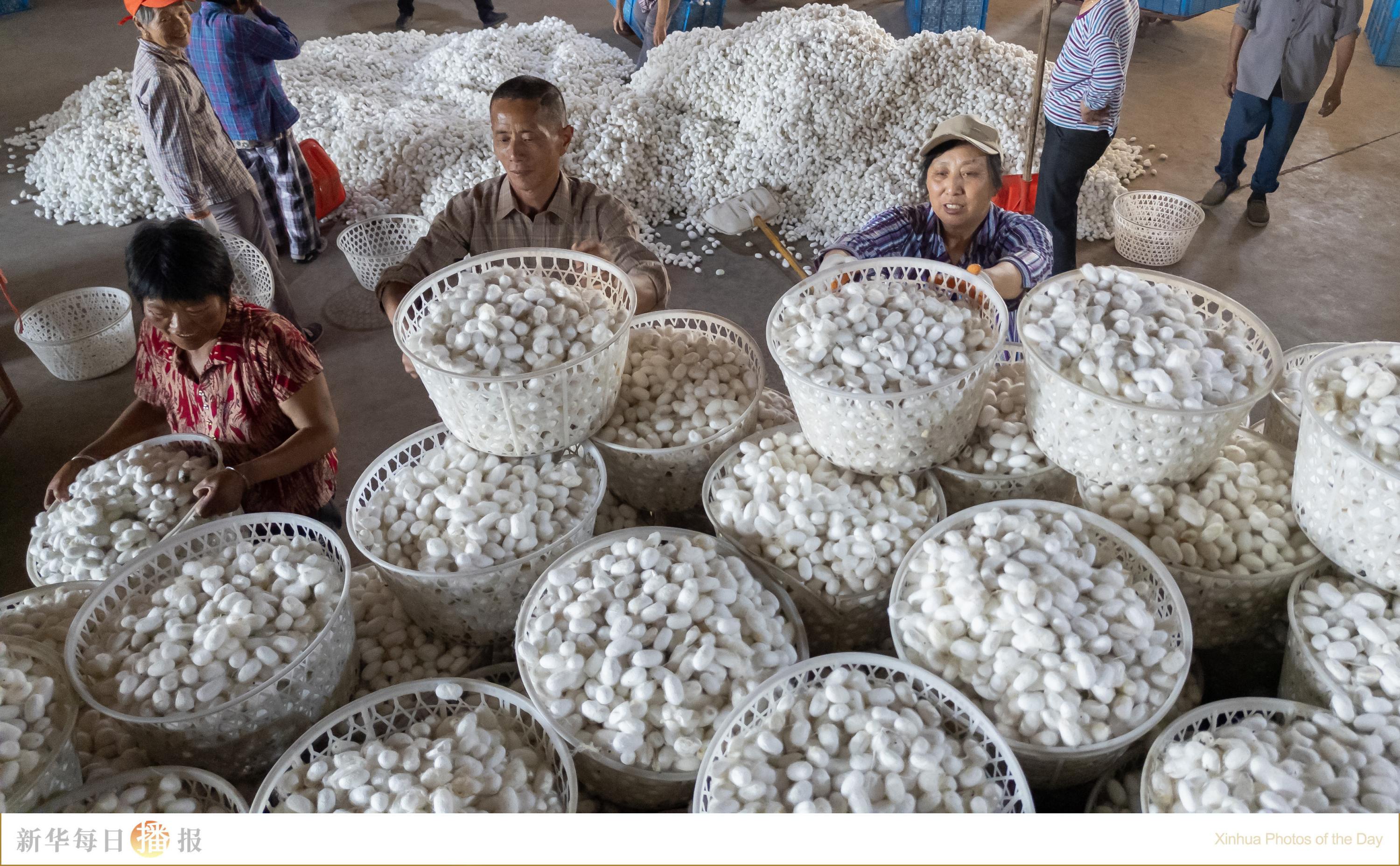 6月4日,在江苏省海安市大公镇群益村蚕茧收购点,村民整理收购的春茧(无人机照片)。日前,江苏南通海安市迎来蚕茧收获季,蚕农抓紧收获和出售蚕茧。近年来,海安市积极推广现代蚕桑生产新品种、新技术和新模式,建设现代蚕业示范园和蚕业家庭农场,已拥有完整的茧丝绸生产加工产业链,带动当地农民就业增收。