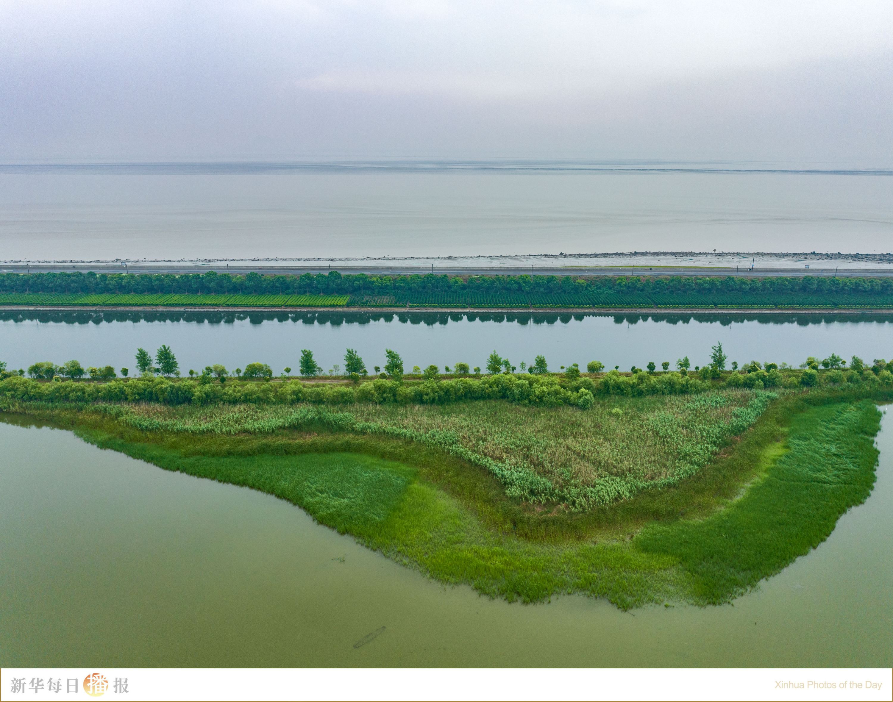 6月5日拍摄的钱塘江下游沿江滩涂湿地风光(无人机照片)。位于钱塘江下游的沿江滩涂湿地水鸟栖息、水草丰美,呈现出一片美丽的湿地风光。目前,此地正在建设湿地面积近4400公顷的杭州钱塘大湾区省级湿地公园。