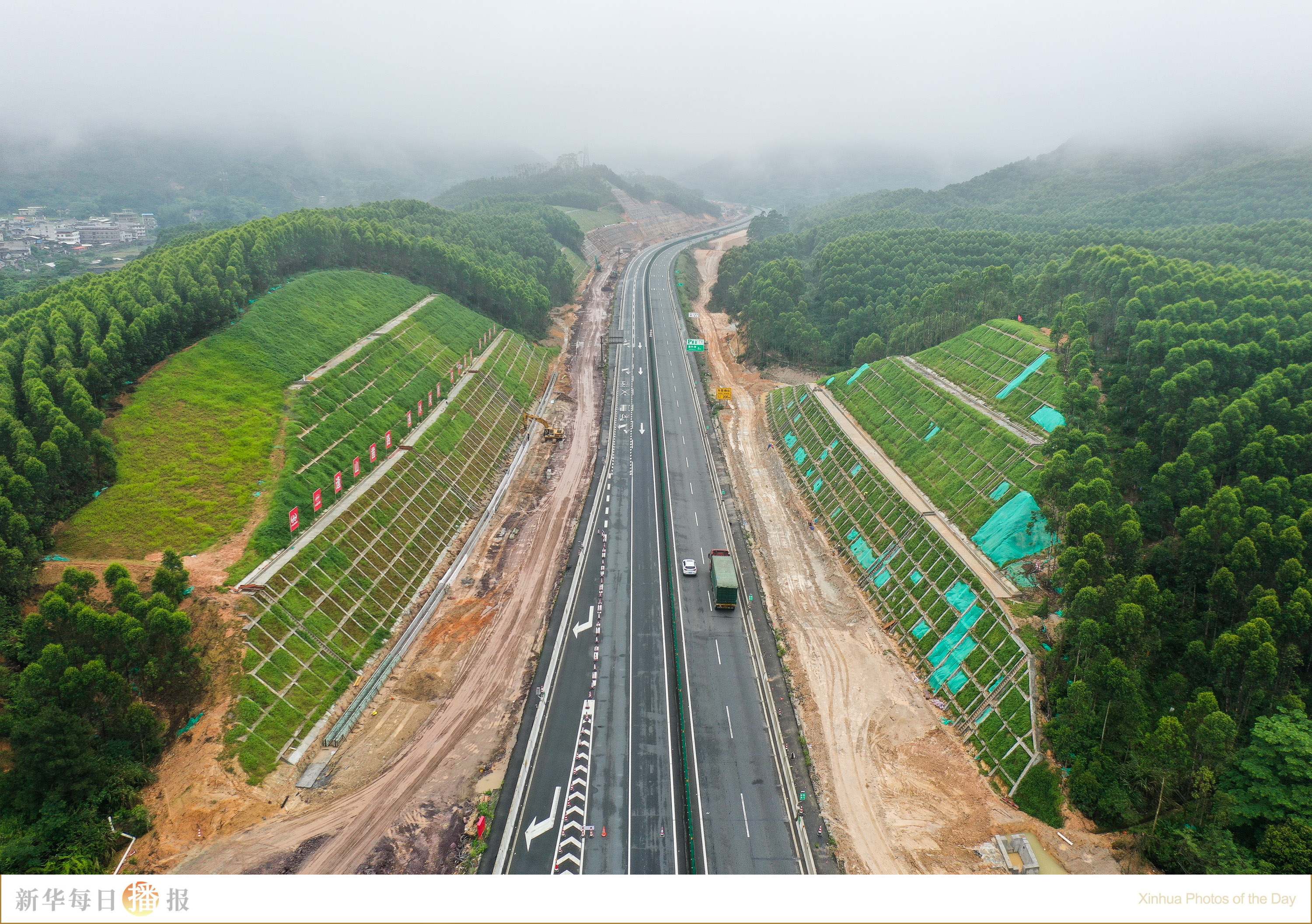 6月5日拍摄的汕梅高速改造完成的高边坡防护带(无人机照片)。汕(汕头)梅(梅州)高速改扩建工程是广东省首条山岭重丘区高速公路改造项目。该路线采用双向八车道高速公路标准进行改扩建,设计时速100公里。