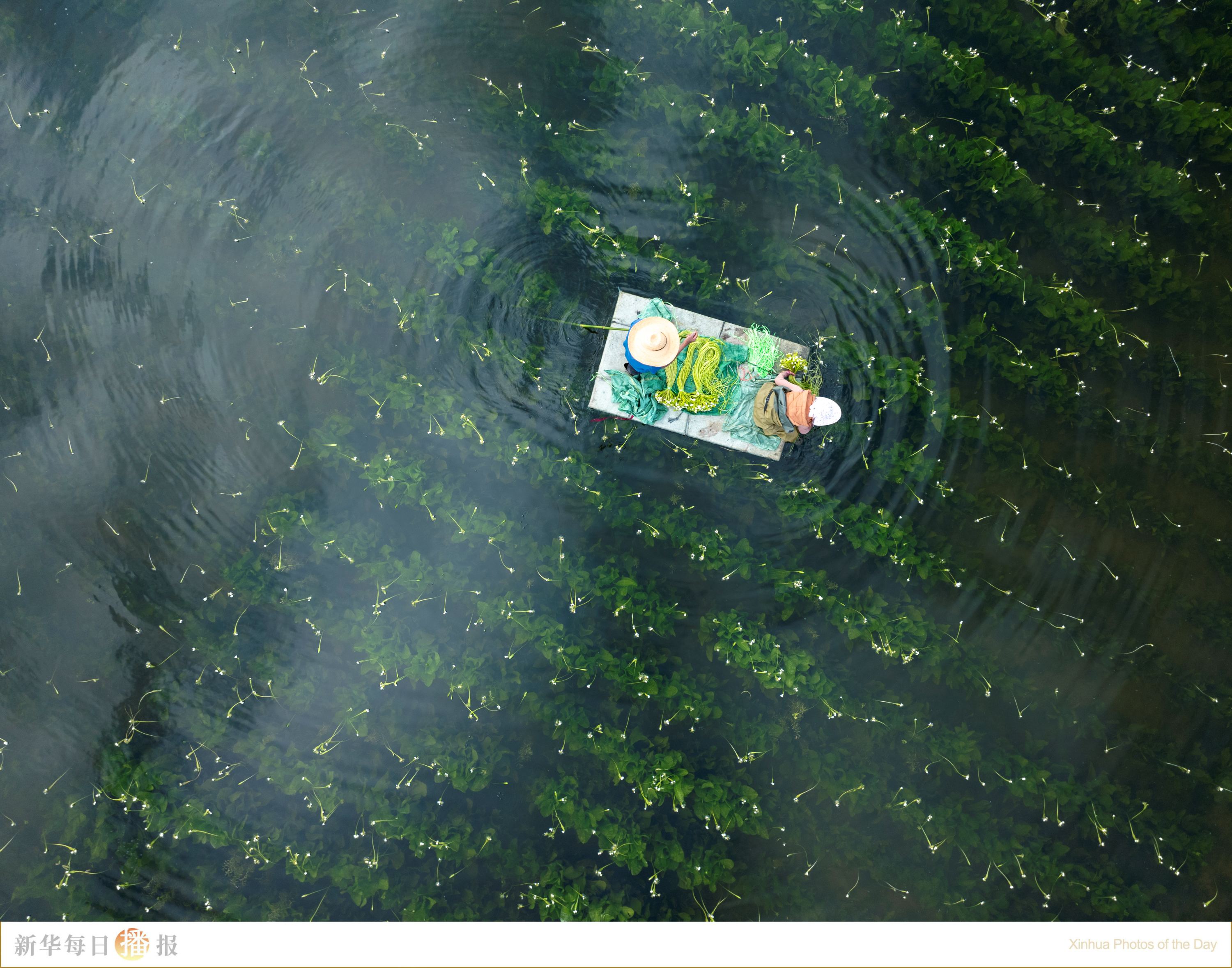 6月5日,在洱源县右所镇永安海菜种植基地,村民在采收海菜花(无人机照片)。近日,云南省大理白族自治州洱源县海菜种植户紧抓农时,抢收海菜。海菜花对生存环境的水质要求高,被视为水质的“试金石”与“风向标”。