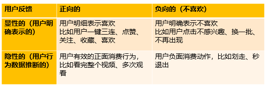 那么隐性的就是指用户没有非常明确表达,但我们可以通过用户行为推断,比如用户观看时长很长、反复点击过则是正面,比如用户秒退出则是负面的。