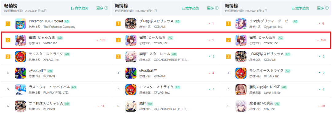 这周看榜单时,发现《雀魂》一路从日本iOS畅销160多位杀到第2,仅次于大热的《宝可梦TCGP》,这涨幅看着有点吓人,不过算是最近几年《雀魂》的常规操作。去年11月16日、4月26日,以及前年11月17日,它都冲到过同样的位置。