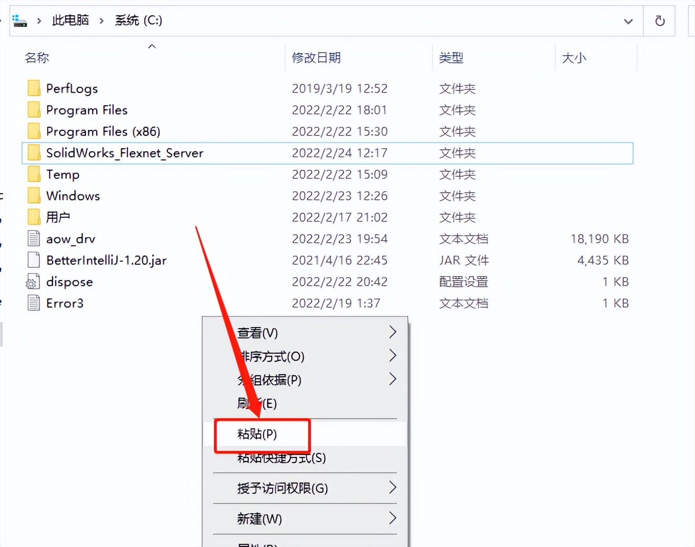 10.在打开的系统C盘中,鼠标右击空白处选择【粘贴】。
