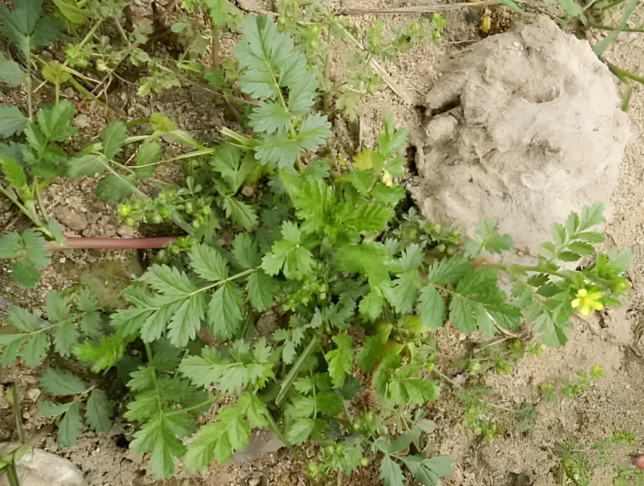 那朝天委陵菜是一种什么样的植物呢?其实它是蔷薇科、委陵菜属的一种植物,也是一种一年生或者二年生的草本植物。植株的茎平展,也能够直立生长,长度在20厘米到50厘米之间,我觉得它的茎和红萝卜的茎有点像。