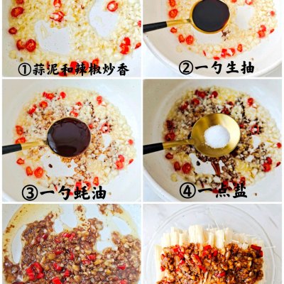 1、①金针菇洗净切跟摆盘 ②热油下去蒜末小米辣炒香 ③加入一勺生抽,一勺蚝油,一点盐翻炒均匀 ④淋到金针菇上面