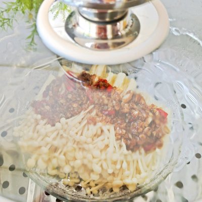 2、提前水烧开,金针菇放蒸锅里蒸8分钟就可以了