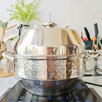 3、这次用的是帝伯朗家的不锈钢蒸锅,容量很大,是三层的,而且是钻石外观纹理,镜面抛光工艺,一眼就相中了!重要的还是304不锈钢,用着安全又放心!