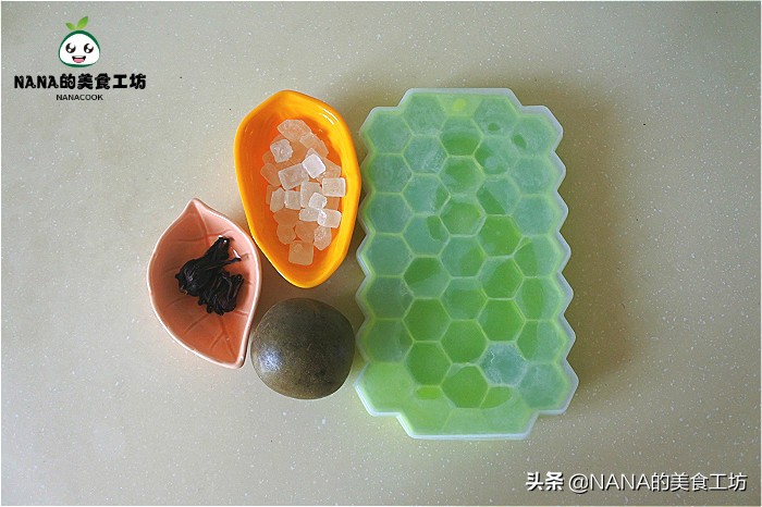 食材:罗汉果半个、洛神花两朵、冰糖适量、冰块适量