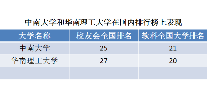 在世界大学学术排行榜中,中南大学排名内地高校第9到17位,华南理工大学排名内地第18到27位。