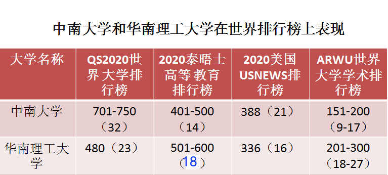在2020年美国usnews排行榜中,华南理工大学排名世界第336位,中国内地高校第16位。中南大学排名世界第388位,内地高校第21位,华南理工大学排名领先。