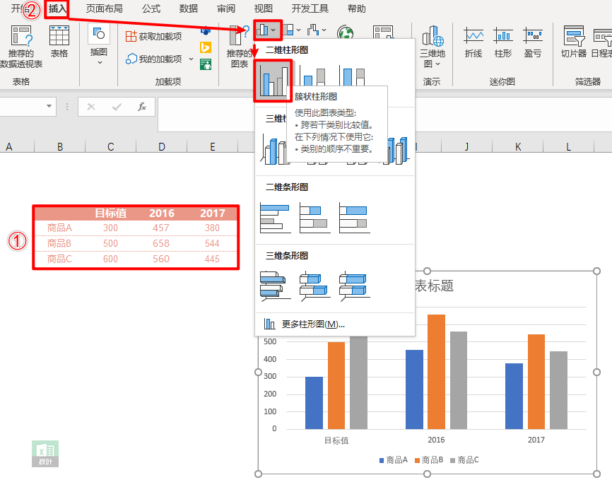 ? 点击【插入】选项卡,插入「二维柱状图」中的「簇状柱状图」。