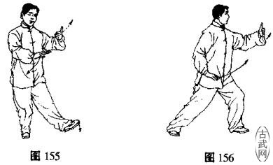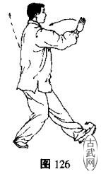 上体微向左转,右臂屈肘折回,右手附于左手腕里侧。上体继续向左转,双手同时向前慢慢挤出,左手心向右,右手心向前,左前臂保持半圆,同时身体重心逐渐前移变成左弓步,目视左手腕部