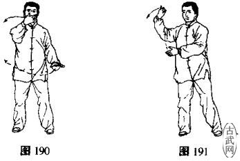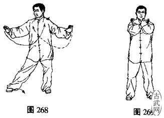 身体微向左转,左手随即前伸,翻掌向下,右手翻掌向上,经腹前向上、向前伸至左前臂’下方,然后两手下抨,即上体向右转,两手经腹前向右后上方划弧,直至右手手心向上,高与肩齐,左臂平屈于胸前,手心向后,同时身体重心移至右腿,目视右手