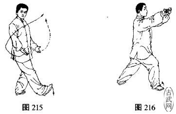 上体后坐,重心移至右腿,左脚尖翘起,微向外撇,脚掌慢慢踏实,左腿慢慢前弓,身体左转,重心移至左腿,同时左手翻转向下,左手臂内旋收至胸前平屈,右手向左上划弧至左手下,两手心相对成抱球状,右脚随即收到左脚内侧,脚尖点地,目视左手