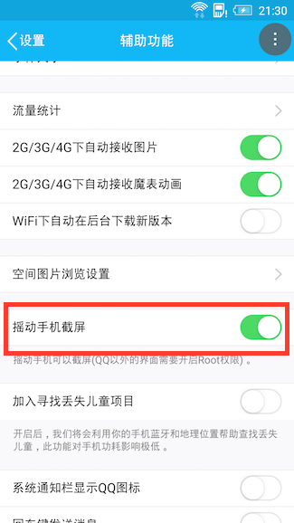 很多Android手机APP也有截图功能,比如:手机QQ,通常都是“摇一摇”截图(如果要截取APP以外的界面,需要获取手机的root权限),这个功能还是非常方便的,不过有时候在大庭广众之下摇手机还是显得有点“傻”,会让周围的人误以为你在“摇一摇”。
