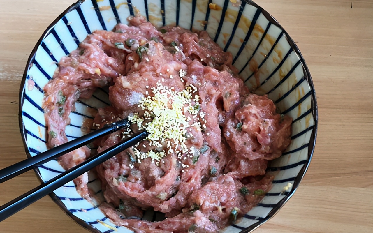 第二步:猪肉清洗干净后切成小块,再放入绞肉机里搅成肉末并倒入大碗中;接着往肉末中加入葱姜末、料酒、清水,再顺着一个方向搅打均匀;然后往肉末中分次加入适量生抽、蚝油、白糖,搅匀后再加入盐、鸡精继续搅匀备用。